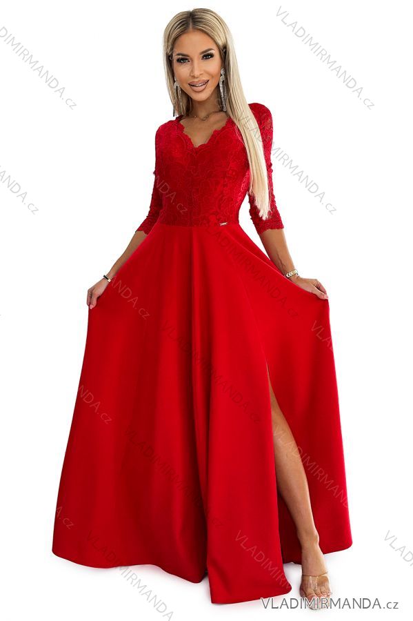 TOVAR (119911) > oblečenie dámske (81207) > šaty (30547) > Šaty spoločenské (4797) > Šaty plesové dlhé (3057) > 309-8 AMBER čipkované, elegantné dlhé šaty s výstrihom a rozparkom na nohách - červené