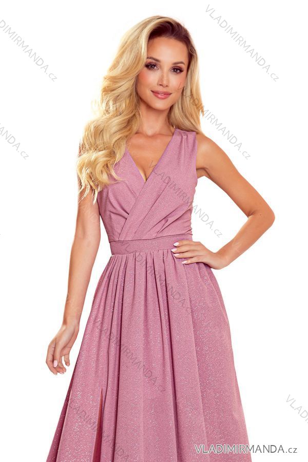 362-1 JUSTINE Dlhé šaty s výstrihom a zaväzovaním - púdrovo ružové s trblietkami NMC-362-1/DR