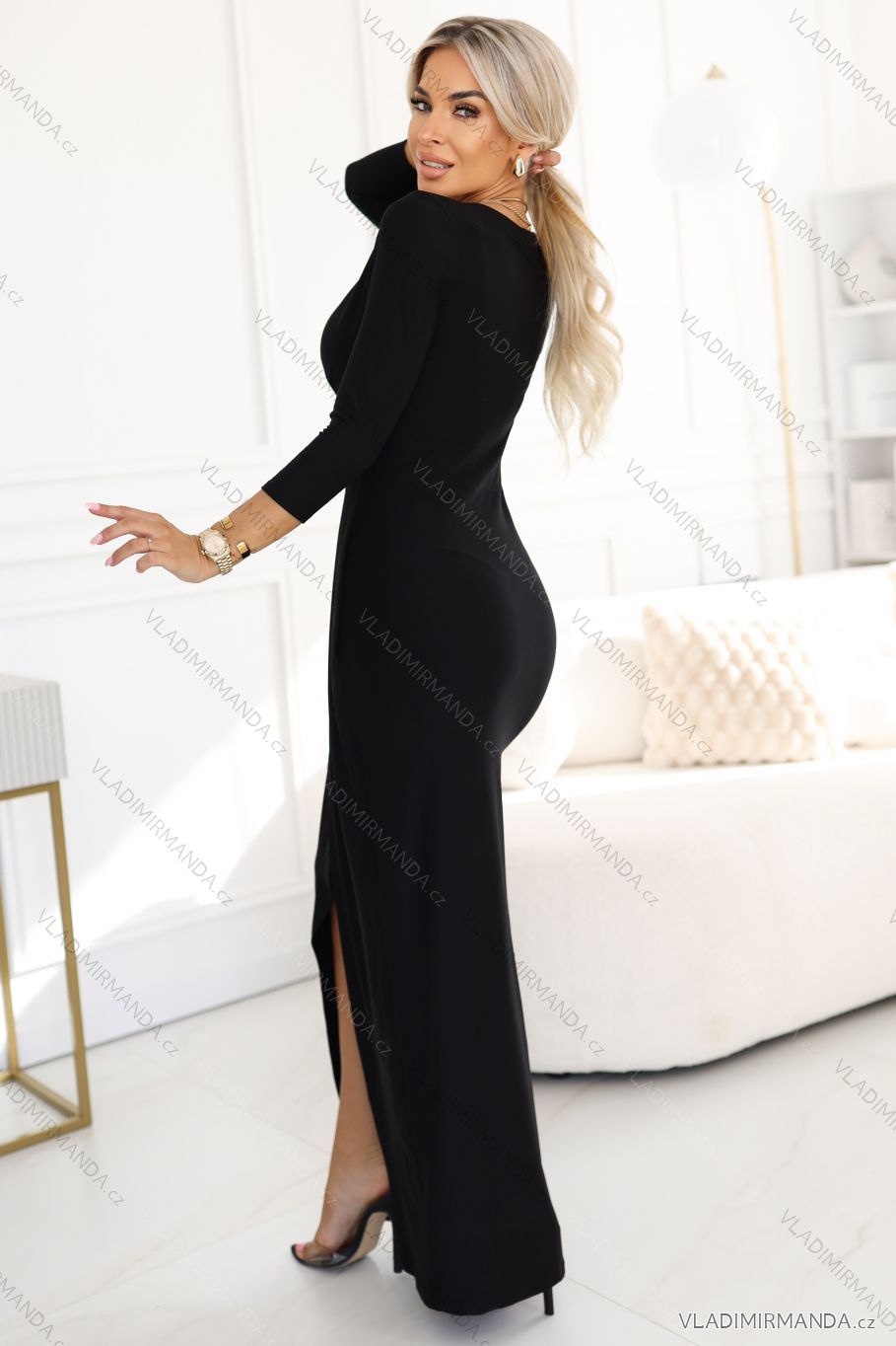 404-13 Elegantné dlhé šaty s výstrihom do vrecka a rozparkom - čierne