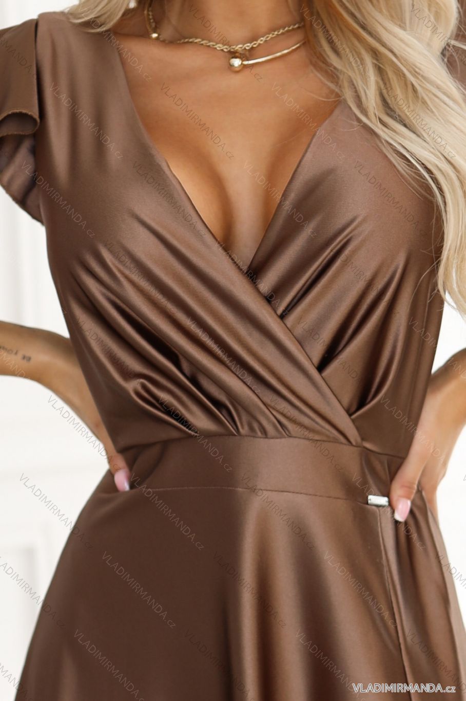 TOVAR (120540) > oblečenie dámske (81647) > šaty (30679) > Šaty spoločenské (5019) > Šaty plesové dlhé (3171) > 411-14 CRYSTAL dlhé saténové šaty s výstrihom - mocha mousse