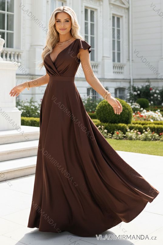 411-15 CRYSTAL saténové dlhé šaty s výstrihom - čokoládové