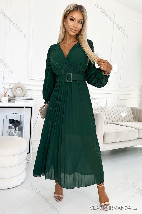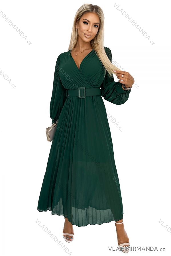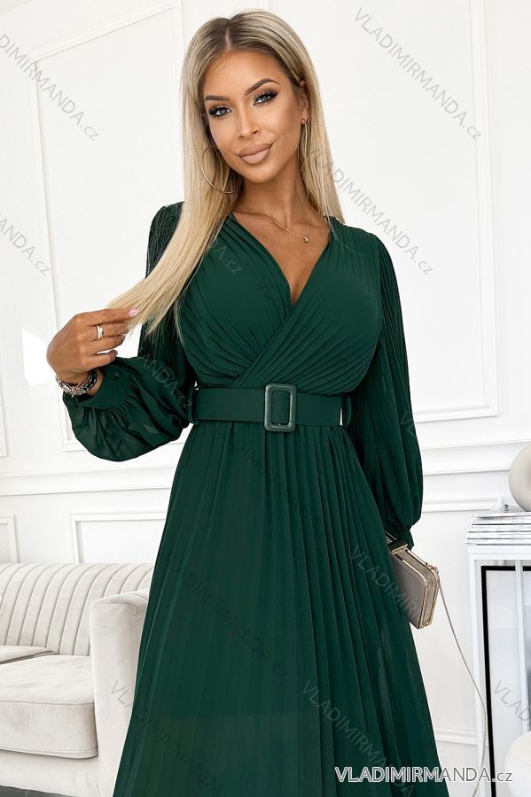 TOVAR (120623) > oblečenie dámske (81733) > šaty (30707) > Šaty spoločenské (5013) > Šaty plesové dlhé (3165) > 414-1 KLARA riasené šaty s opaskom a výstrihom - fľaškovo zelená