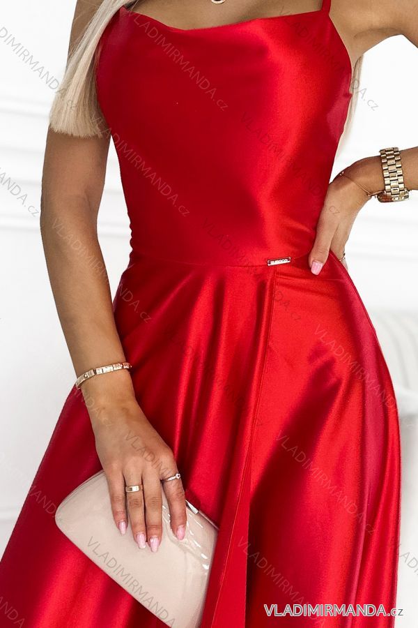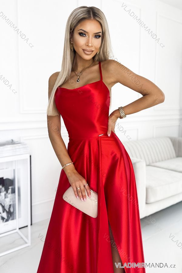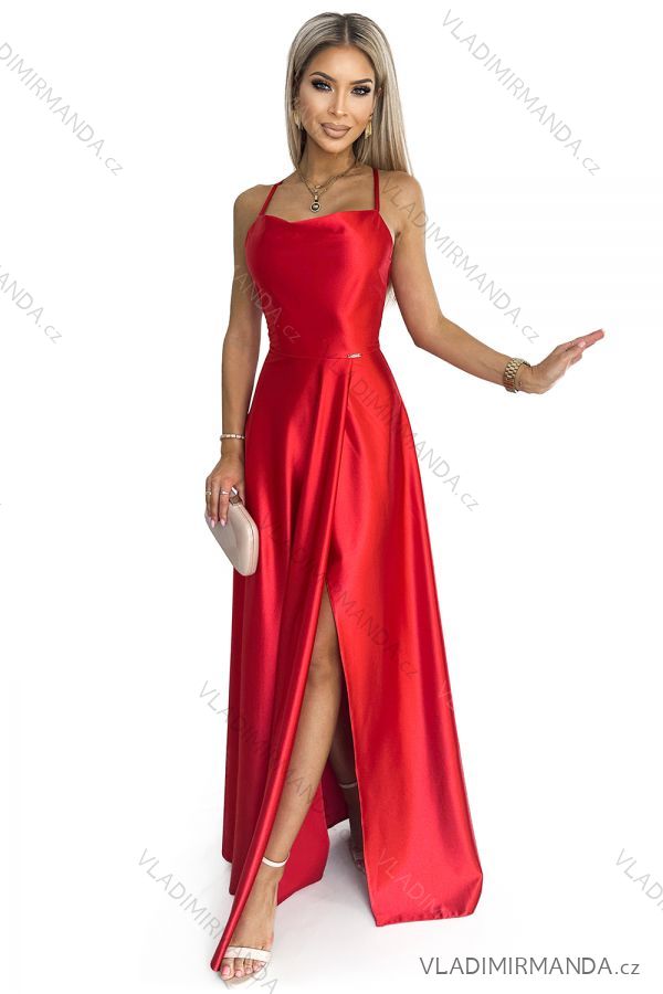 419-1 PERLA saténové dlhé šaty s výstrihom na chrbte - červené