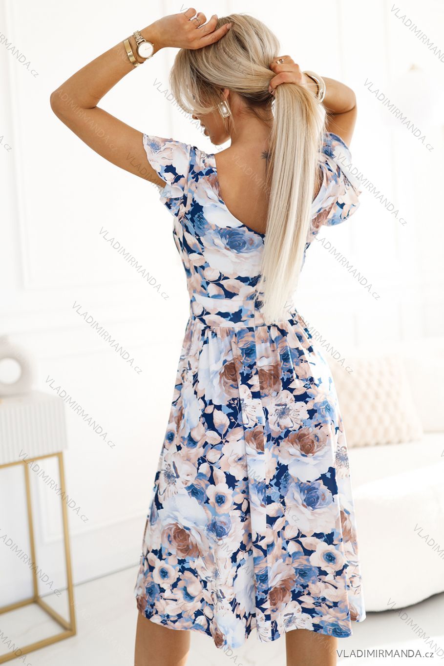 425-13 MATILDE Dámske šaty s výstrihom a krátkymi rukávmi - béžové a modré kvety