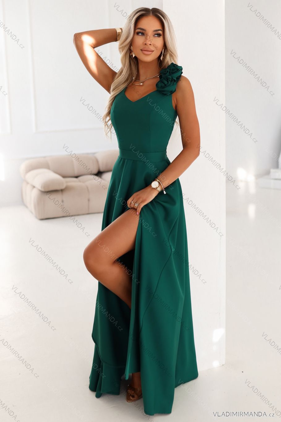 Keďže látka jemne splýva okolo tela, pozornosť upútavajú rozmerné ruže na ramene - jemné, no zároveň výrazné. Toto je ten typ detailu, ktorý okamžite odhaľuje butikový pôvod dizajnu. V kombinácii s výstrihom do V šaty krásne zvýrazňujú krk a poprsie a dodávajú siluete ľahkosť a harmóniu.