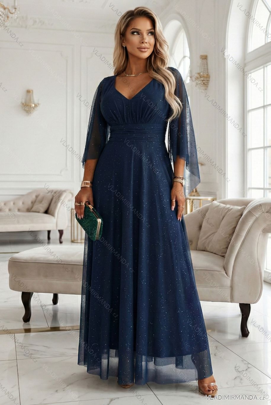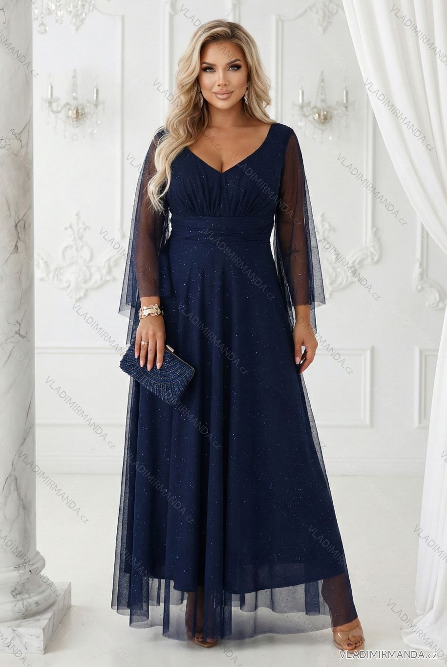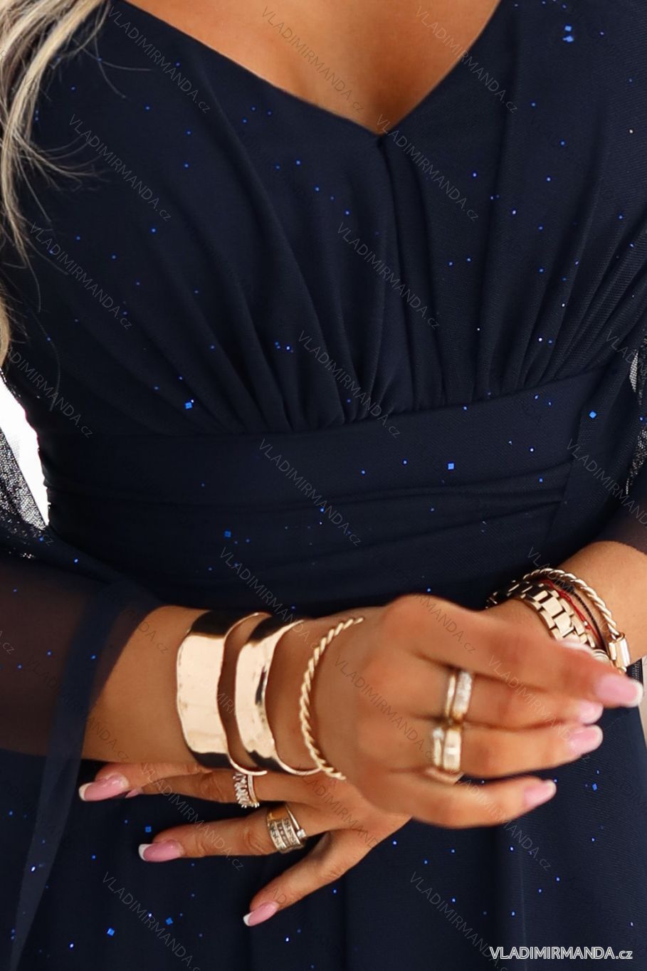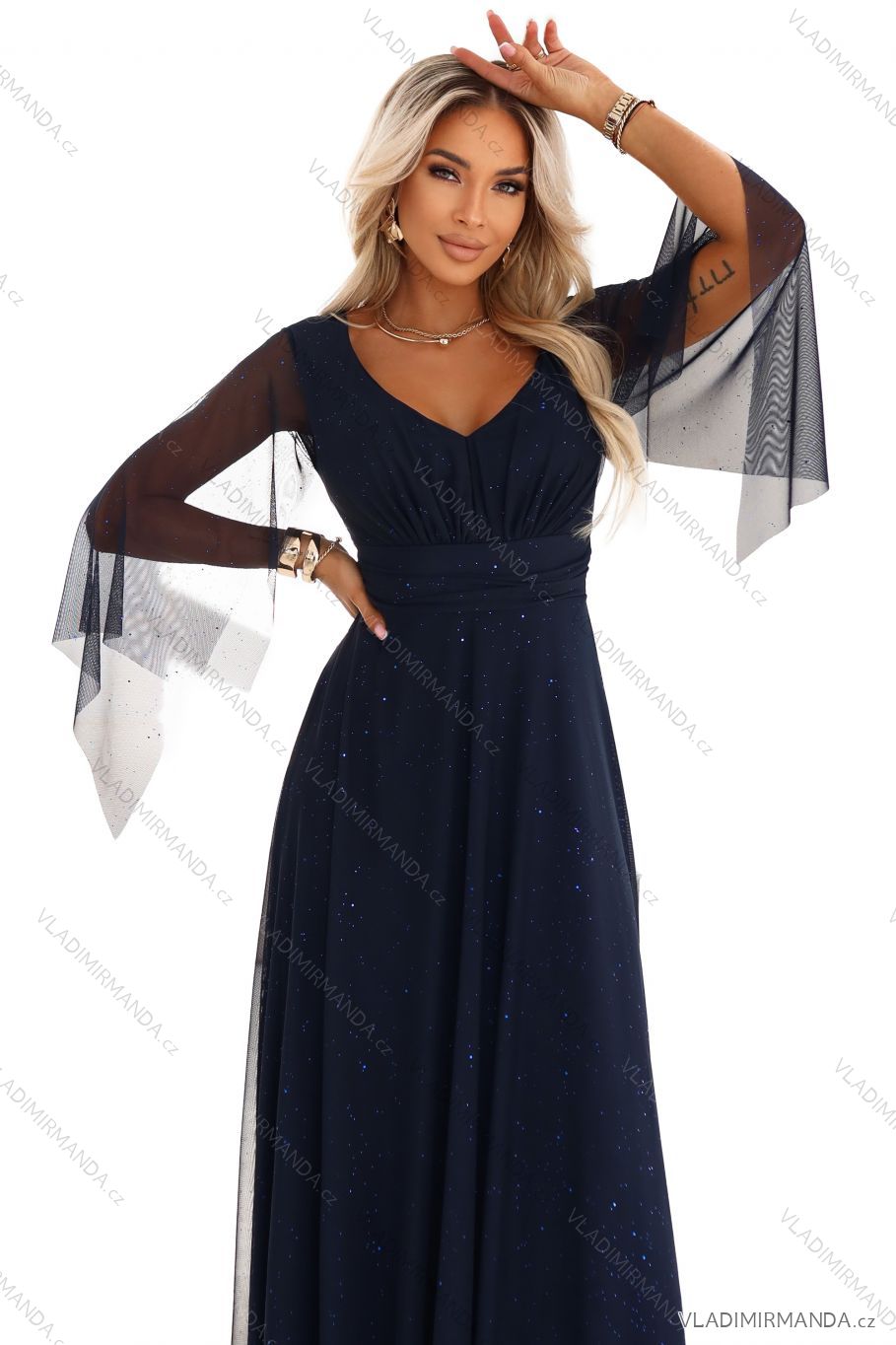 655-3 Dlhé, trblietavé šaty s výstrihom a priehľadnými rukávmi - tmavomodré
