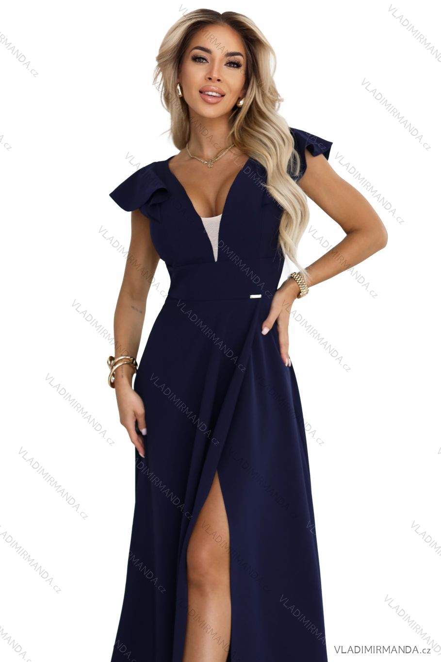 660-1 Elegantné maxi šaty s volánikmi, hlbokým výstrihom a rozparkom na nohavici - tmavomodré