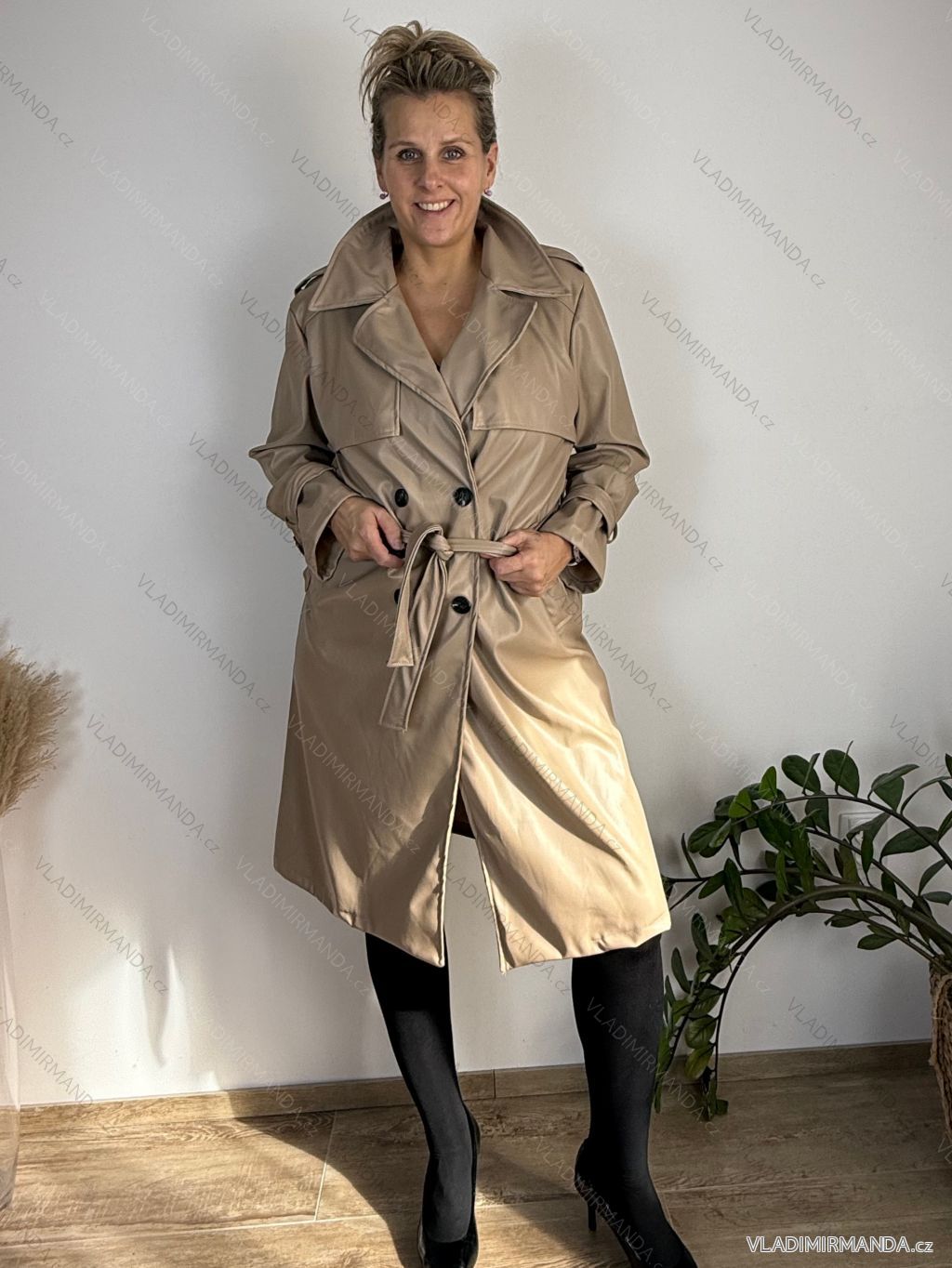Kabát koženkový s opaskom dlhý rukáv dámsky GITA (M/L/XL ONE SIZE) TALIANSKA MÓDA IMWCA2824