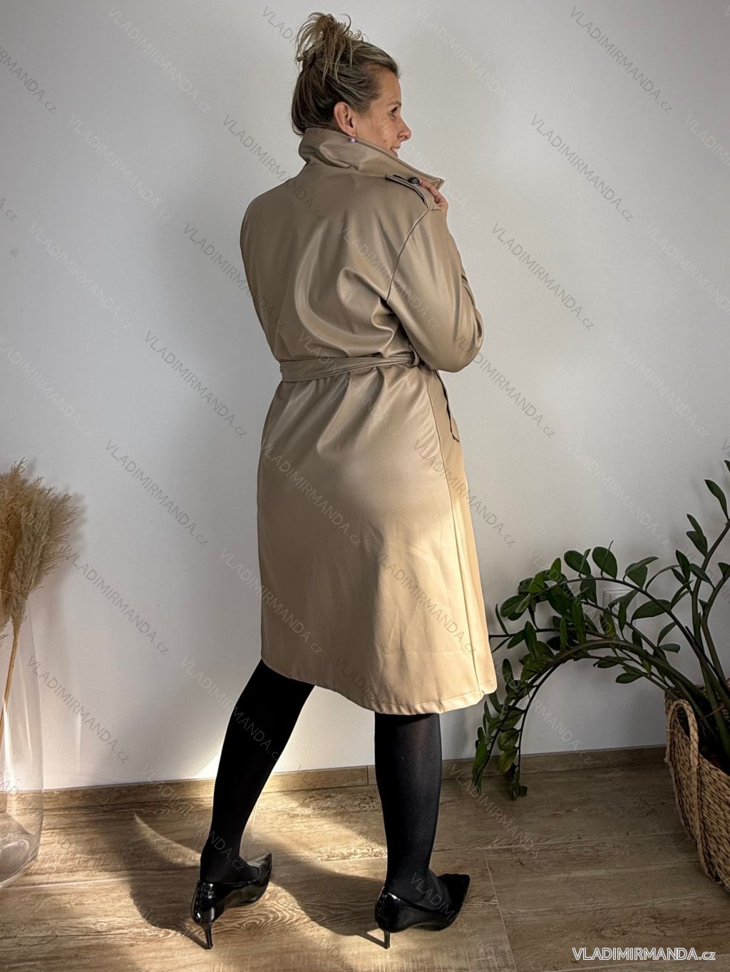 TOVAR (119481) > oblečenie dámske (80897) > Bundy, kabáty, vesty a saka (8665) > kabáty dámske (3531) > Kabáty jarná-jesenná (1614) > Kabát koženkový s opaskom dlhý rukáv dámsky GITA (M/L/XL ONE SIZE) TALIANSKA MÓDA IMWCA2824