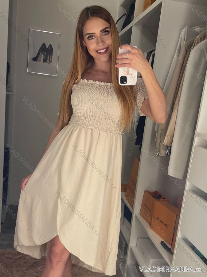 Ľahké letné šaty carmen žabičkované cez prsia. Sukne s prekladaným rázporkom. Vhodné na romantické prechádzky, letné posedenie s priateľmi aj do spoločnosti.