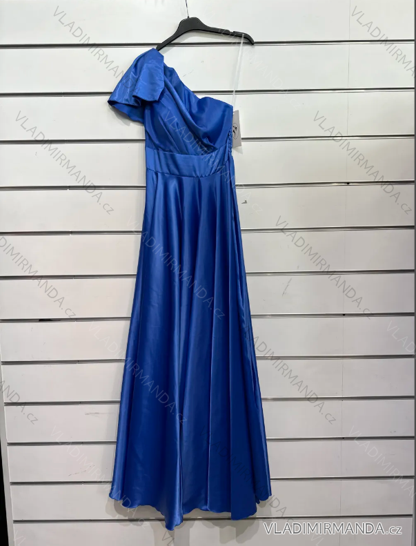 Dlouhé společenské šaty na jedno rameno. Šaty mají prsní vycpávky a na zádech žabičkování, díky kterému jsou pružné přes prsa.