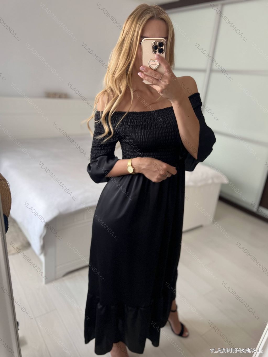Dlouhé šaty se žabičkováním, carmen výstřihem a krátkým rukávem.