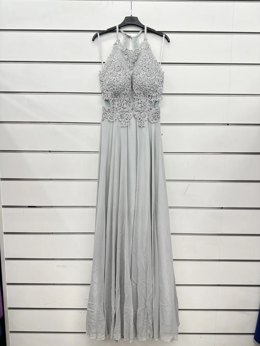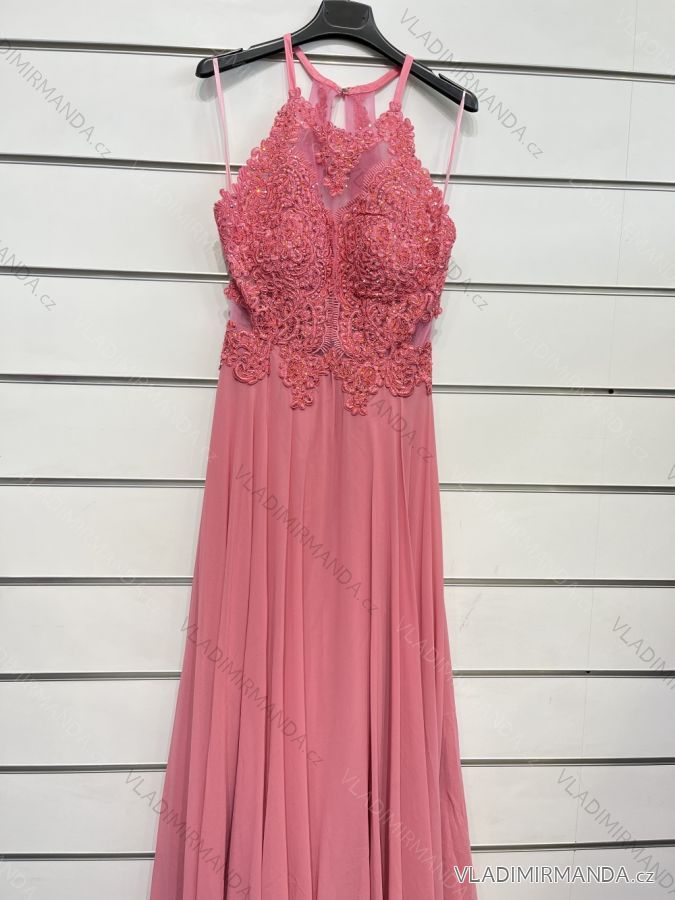 Dlouhé společenské šaty na ramínka. Šaty mají prsní vycpávky, zapínání na zip na boku a vzadu žabičkování, díky kterému jsou pružné přes prsa.