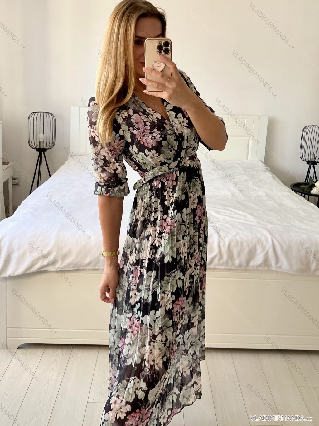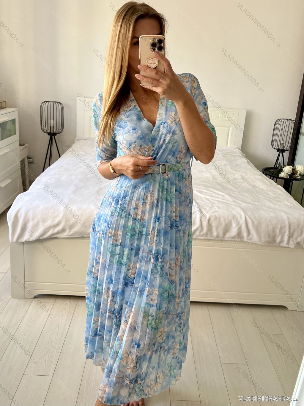Dlouhé šifonové šaty se skládanou sukní, páskem a dlouhým rukávem.