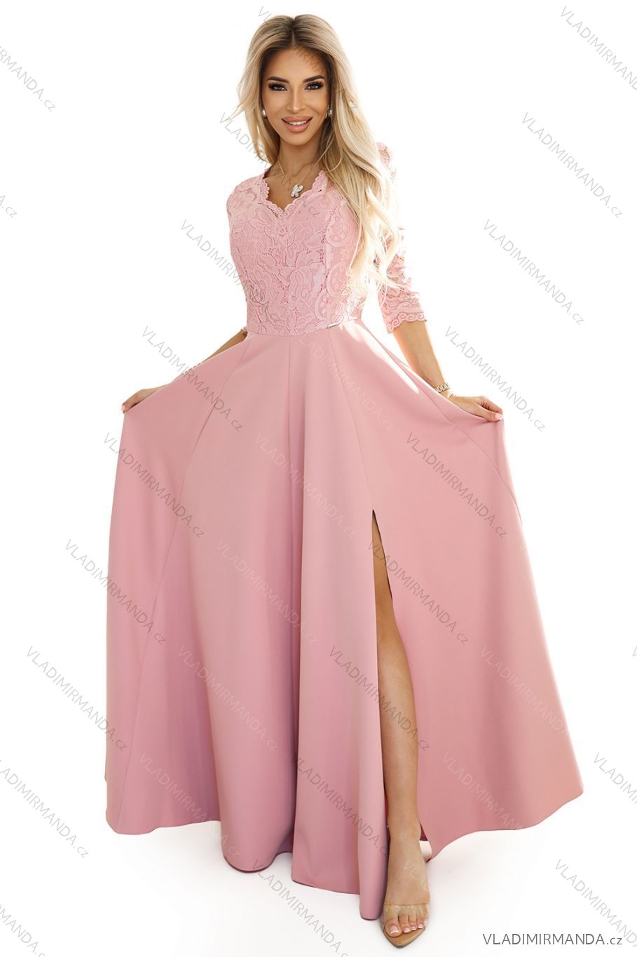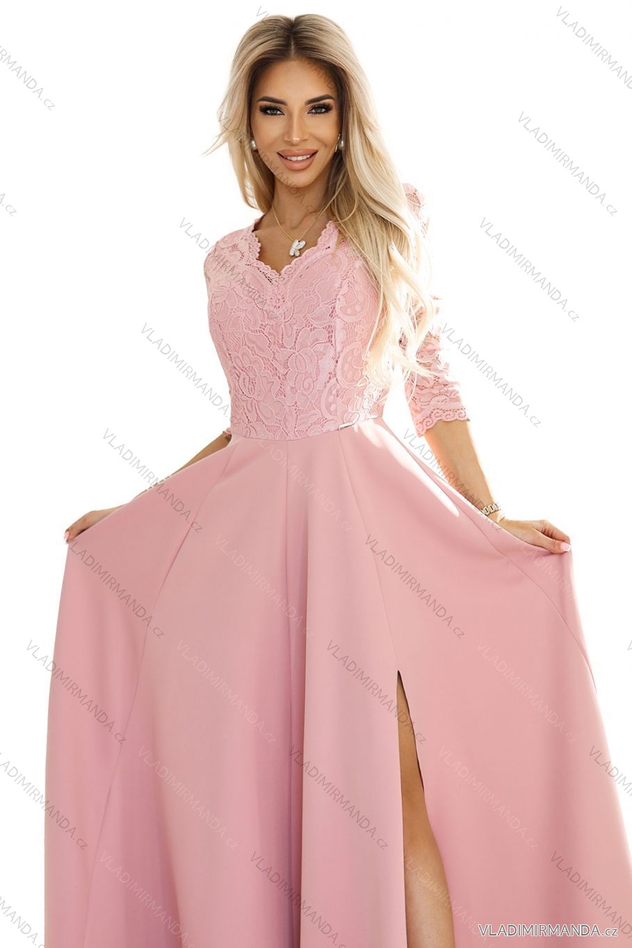 TOVAR (120465) > oblečenie dámske (81583) > šaty (30635) > Šaty spoločenské (5001) > Šaty plesové dlhé (3193) > Šaty elegantné spoločenské krajkové dlhé 3/4 rukávy Amber (S-2XL) POLSKÁ MÓDA NMC-309-13/DR L ružová svetlá
