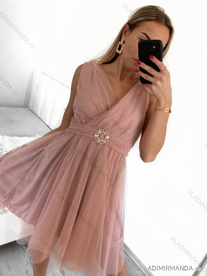 Šaty elegantné tylové krátke bez rukávov spoločenské dámske (S/M ONE SIZE) TALIANSKA MÓDA IMM239074/DUR S/M staroružová