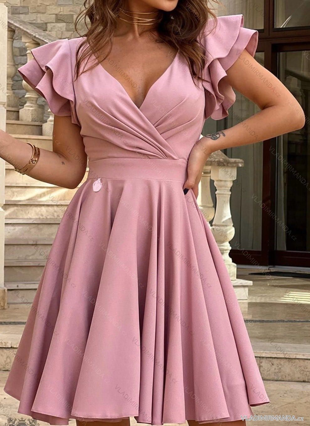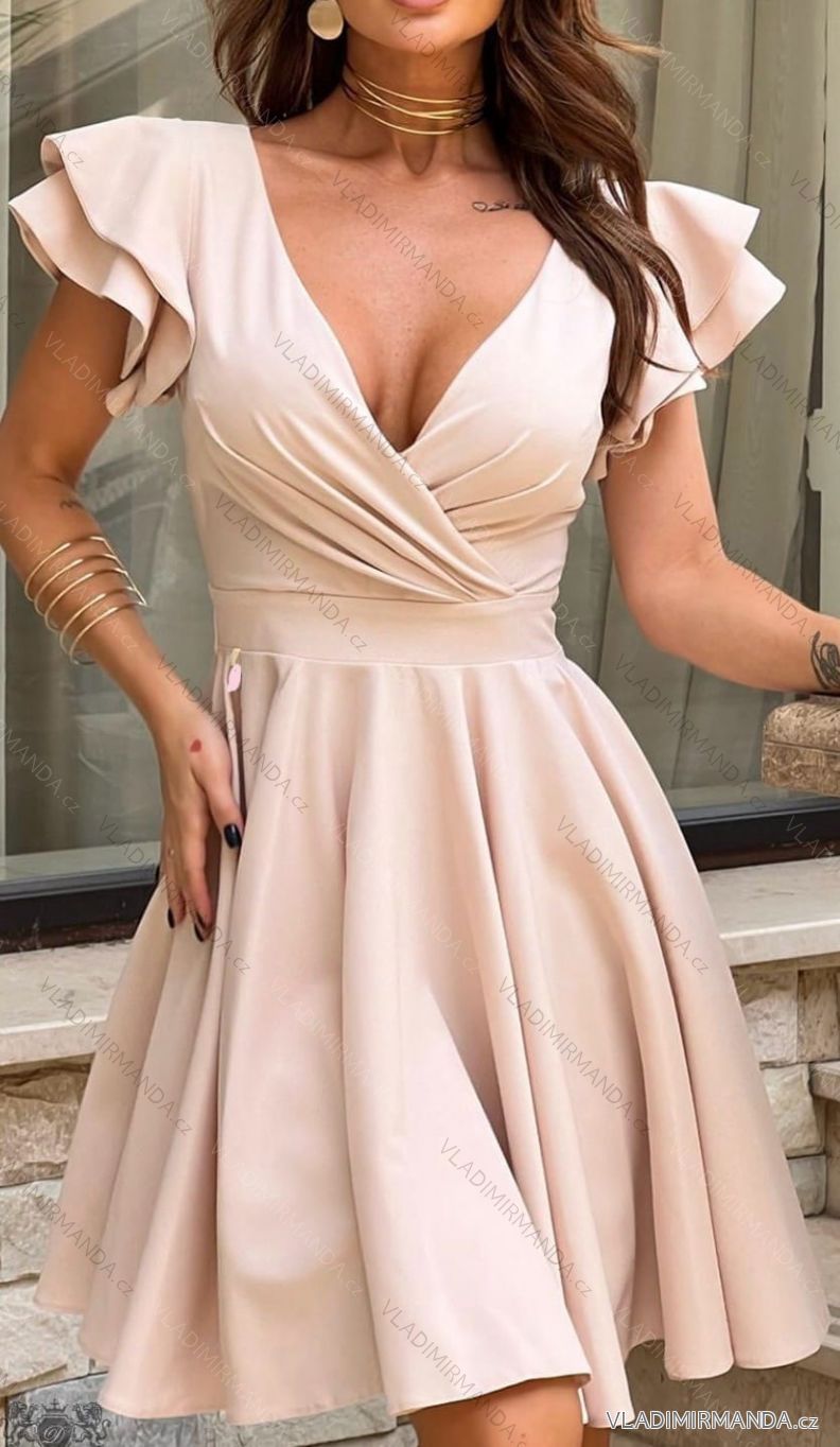 Krátke elegantné šaty s volánikovým rukávom, na chrbte zapínanie na zips
