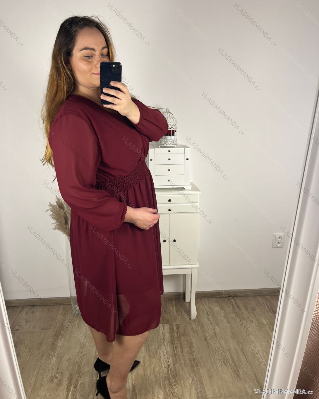 TOVAR (120077) > oblečenie dámske (81344) > šaty (30625) > Šaty elegantný šifonové, žabičkování dlhý rukáv dámske nadrozměr (X/2XLL ONE SIZE) TALIANSKA MóDA IM422VERONA vínová XL/2XL