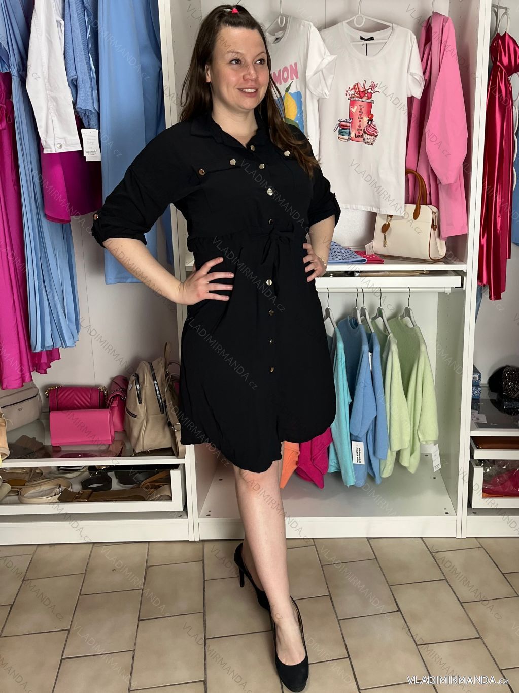 Šaty košeľové 3/4 dlhý rukáv dámske (S/M/L ONE SIZE) TALIANSKA MÓDA IMD25030/DUR S/M/L čierna
