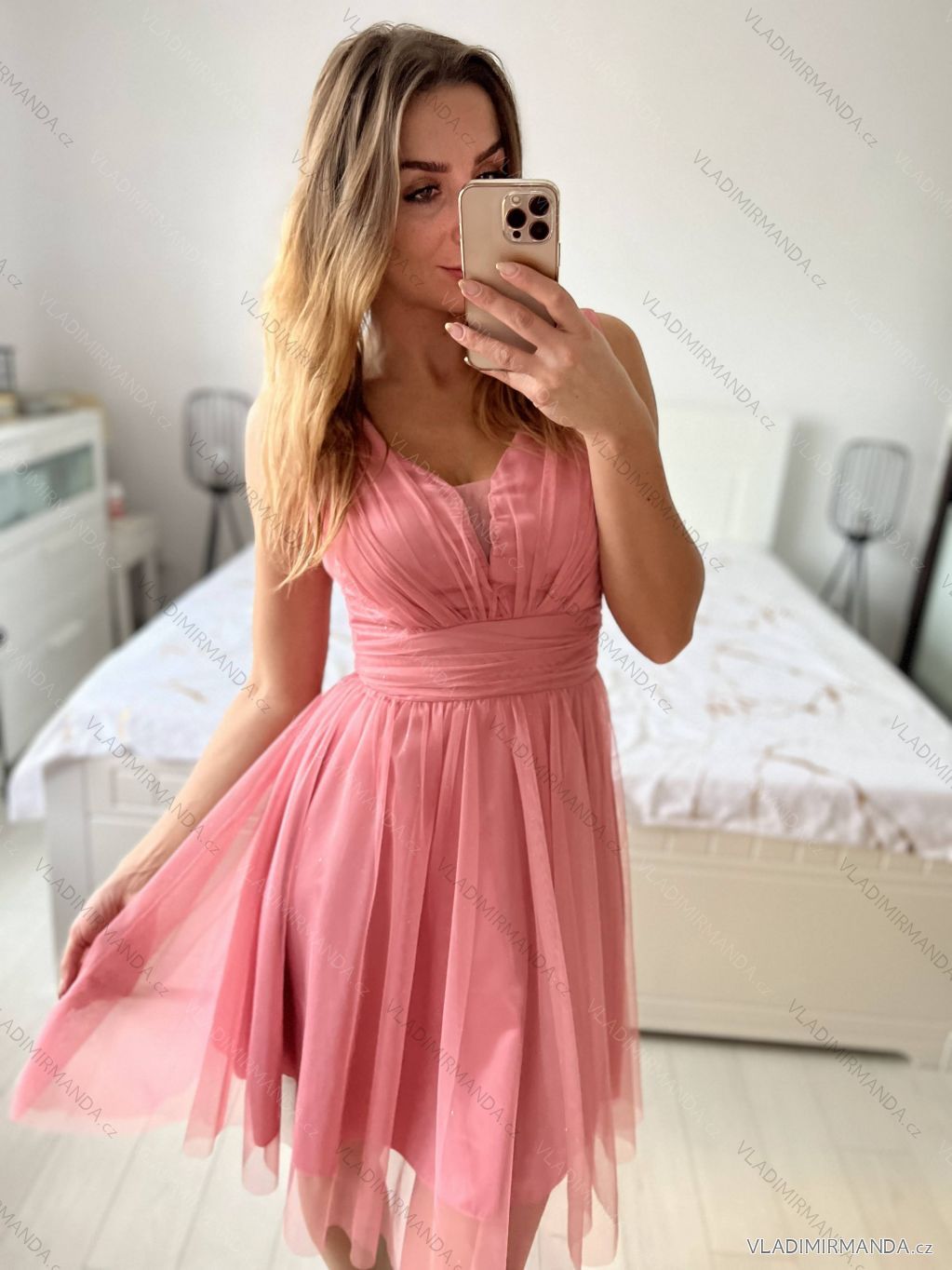 Krátké plesové šaty se širokými tylovými ramínky a tylovou sukní. Šaty jsou poseté drobnými třpytivými kamínky. Součástí jsou prsní vycpávky a na zádech mají žabičkování, díky kterému jsou pružné přes prsa a zavazovací mašli.