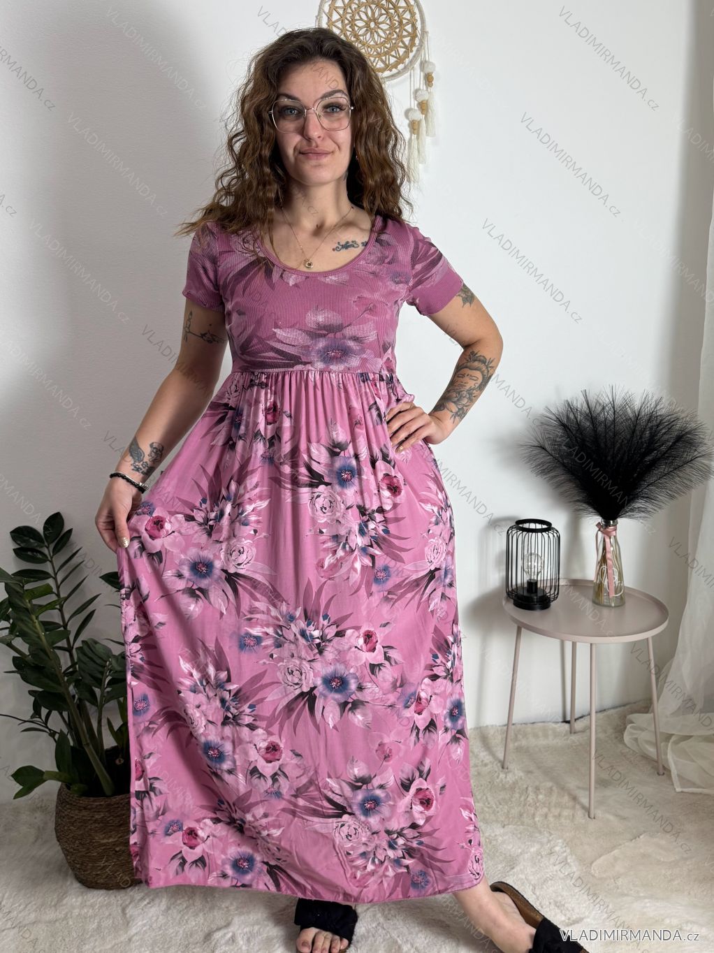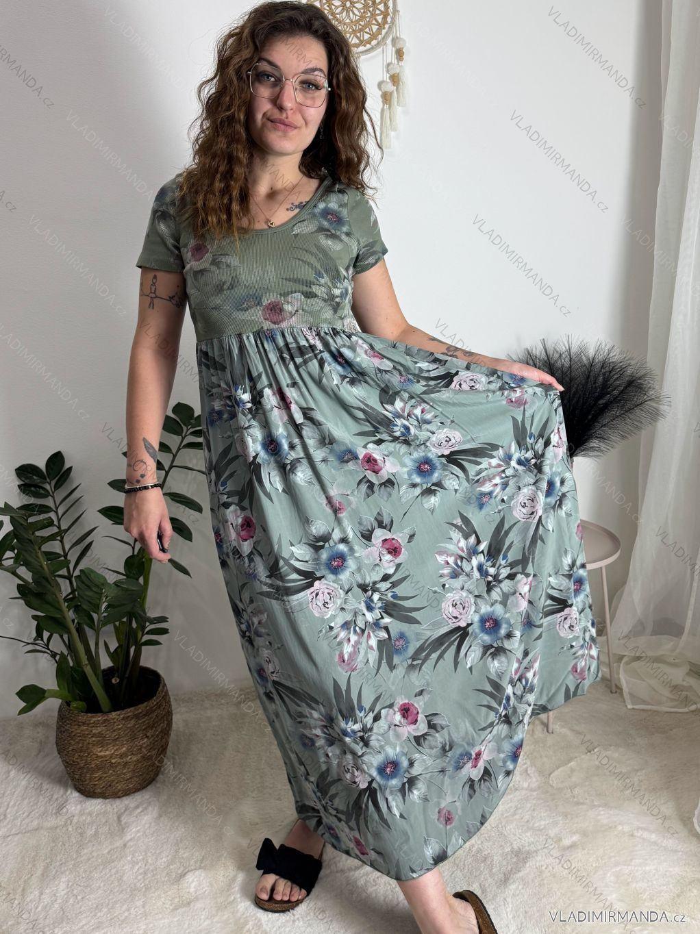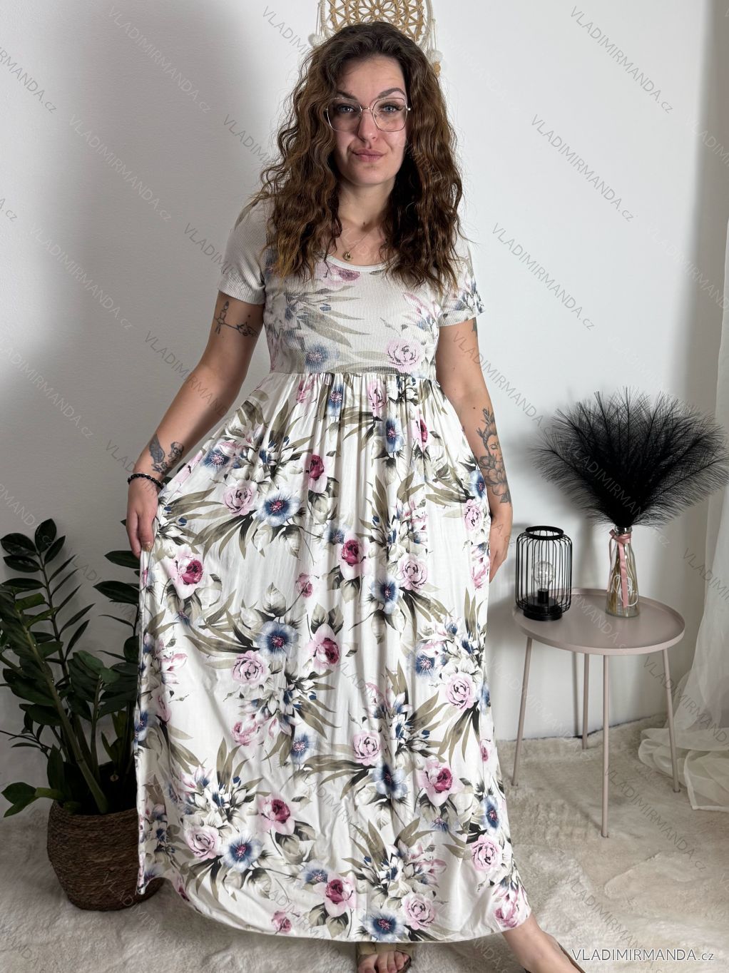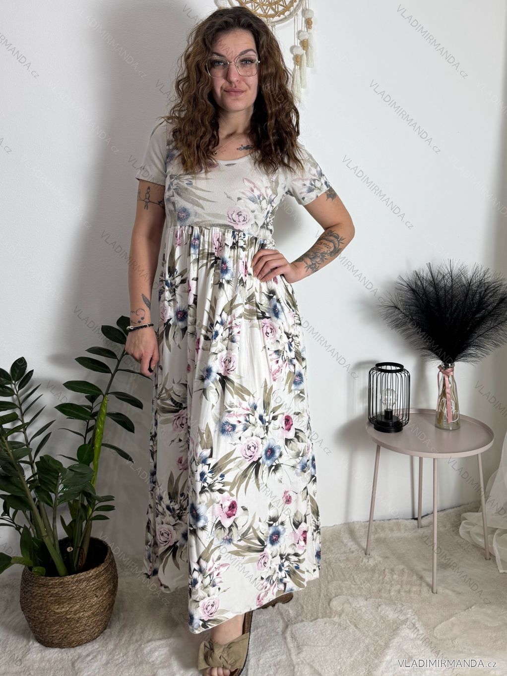 Letná romantika: Šaty s jemným kvetinovým vzorom v kombinácii s neutrálnym pozadím tvoria harmonický a ženský celok.