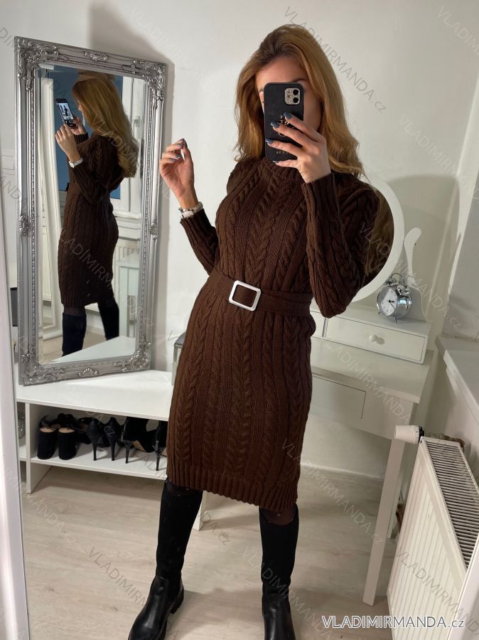 Šaty pletené s rolákom dlhý rukáv dámske (S/M ONE SIZE) TALIANSKA MÓDA IMWAA223600/DR S/M hnedá
