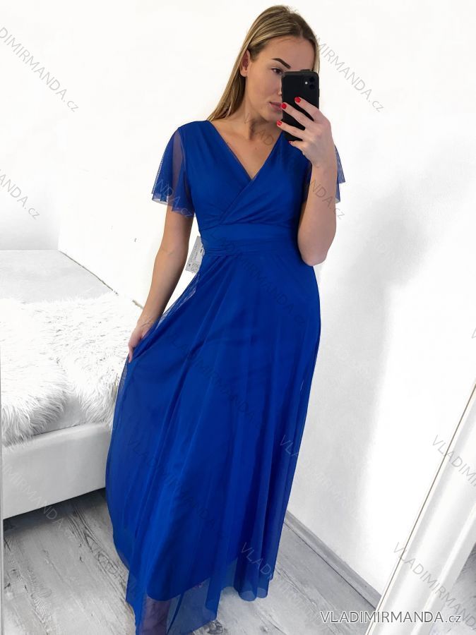 Dlhé spoločenské šaty s tylovými rukávmi. Šaty majú prsné vypchávky a vzadu zaväzovanie na mašľu.