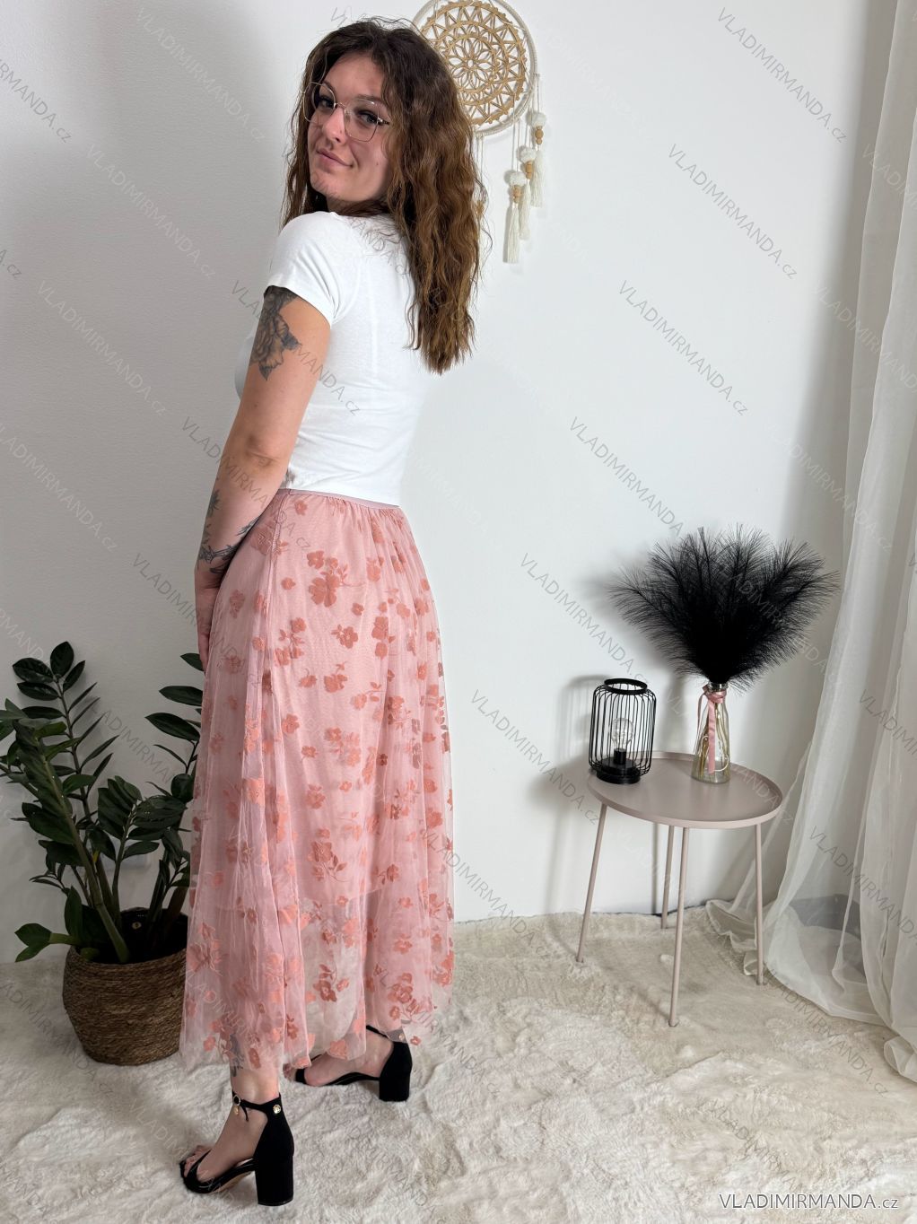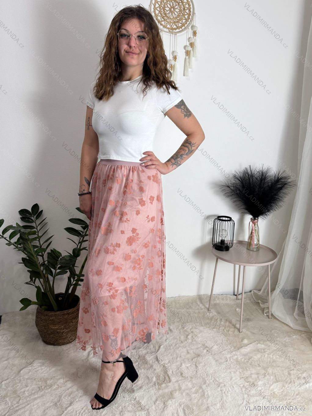 Sukňa je potiahnutá jemným tylom s bohatou kvetinovou výšivkou, ktorá dodá vášmu outfitu romantický a jedinečný vzhľad.