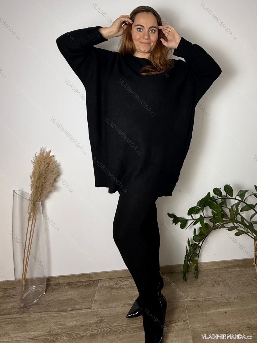 Sveter prodloužený úpletový dlhý rukáv dámsky nadrozměr GINNY (54/56/58 ONE SIZE) TALIANSKA MÓDA IM425784/DU 54/56/58 čierna